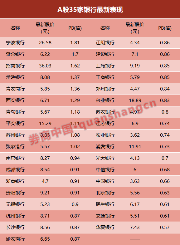 今年以来,受外界市场波动、经济下行压力下银行资产质量担忧、金融业开放竞争愈加激烈等多方面影响,目前A股35只银行股中,破净银行股达到25家,占比超过七成。