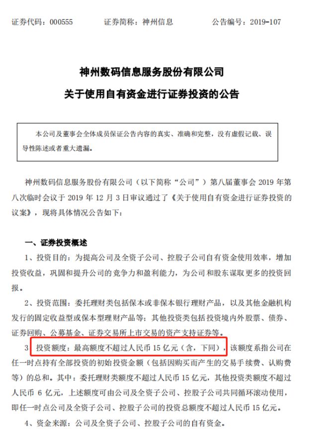 据上述公告显示,神州信息的董事会临时会议审议通过了自有资金进行证券投资的议案,公司拟使用15亿元自有资金进行证券投资。