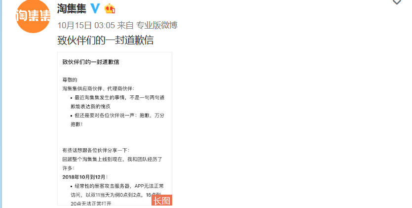 不到两个月前的10月15日,淘集集CEO张正平在官方微博发布了“致伙伴们的一封道歉信”,承认资金链断裂,还不上货款。