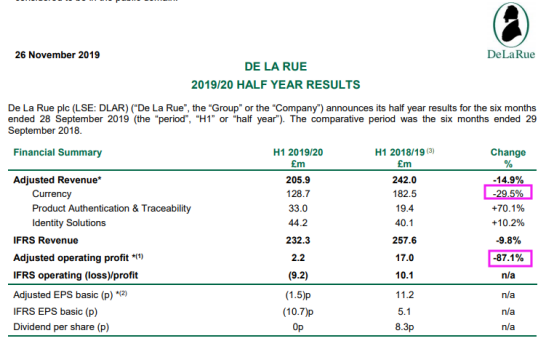 在最新公布的半年报中,德拉鲁的主营业务——印钞的营收下降了29.5%,这直接导致了该公司上半年的净利润下降了87.1%。