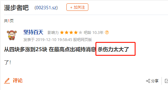 对于12月10日晚间突如其来的减持公告,12月10日买入的投资者想必有所担忧,股吧中也有投资者称减持公告杀伤力很大。
