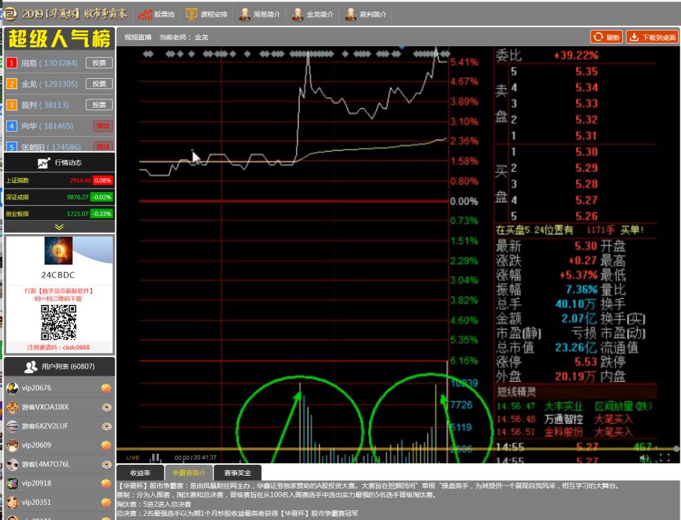 券商中国记者按图索骥,来到该2019【华夏杯】股市争霸赛“大赛”的直播间,首当其冲的是直播老师(即两名比赛“冠亚军”)的嘶吼:“买入、收阳线、拉伸、收钱跑路!”、“如果你不做,你将继续错过明年的行情!”“我们是怎么判断市场已经到这个位置了!”“回答我!我们要做什么方向!”