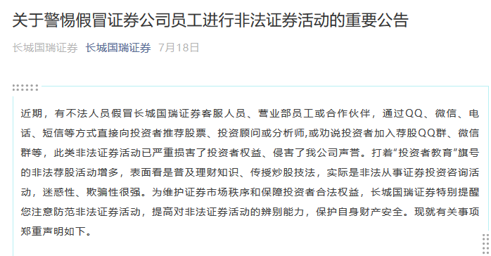 例如,今年以来已有长城证券、第一创业、首创证券、华安证券多家券商发布“警惕假冒公司/公司员工进行非法证券活动”的公告,不法分子通过微信、电话、QQ等多种方式联系投资者,进行网络荐股、收取会员费、“代客理财”等非法活动。