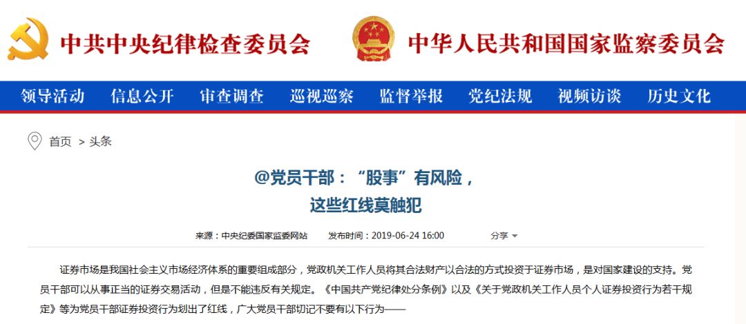 今年6月,中央纪委国家建委网站发布头条文章,为全体党员干部“股事”划出红线。文章指出,证券市场是我国社会主义市场经济体系的重要组成部分,党政机关工作人员将其合法财产以合法的方式投资于证券市场,是对国家建设的支持。党员干部可以从事正当的证券交易活动,但是不能违反有关规定。