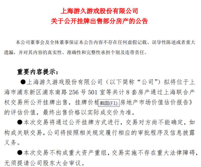 12月12日晚间,沪市公司*ST游久(600652)发布关于公开挂牌出售部分房产的公告。