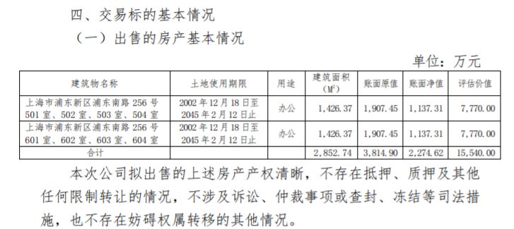 公司称,为盘活和优化公司存量资产,并为公司下一步发展创造更大空间,董事会同意,公司拟通过上海联合产权交易所将位于上海市浦东新区浦东南路256号(华夏银行大厦)501室等共计8 套房产公开挂牌出售,出售的房产建筑面积合计 2,852.74 平方米,挂牌价格参考上海沪港房地产估价有限公司(以下简称“估价机构”)出具的《房地产市场价值估价报告》 (沪港房报估字[2019]第 3207 号)的评估价值1.554亿元,最终出售价格以实际成交价为准。