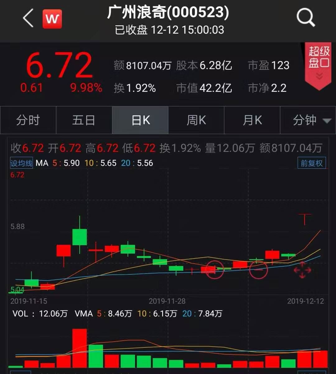 12月12日开盘,广州浪奇再度一直涨停,这也是拆迁消息落地后,公司迎来的第二个涨停板。截至12月12日收盘,广州浪奇报收6.72元。