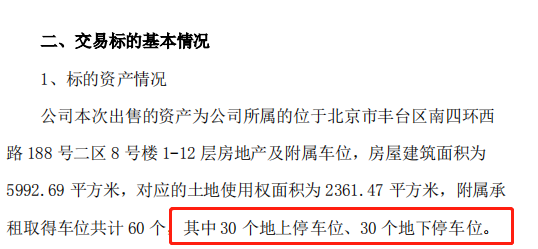 据上市公司中成股份最新披露的《关于以公开挂牌方式出售资产的议案》公告显示,本次出售的资产为公司所属的位于北京市丰台区南四环西路188号二区8号楼1-12层房地产及附属车位,总价值达2.75亿元。据披露,资产房屋建筑面积为5992.69平方米,对应的土地使用权面积为2361.47平方米,附属承租取得车位共计60个,其中30个地上停车位、30个地下停车位。