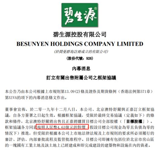 比如在港股上市的“减肥茶第一股”碧生源最近的出售资产动作,引来了市场关注。12月8日,碧生源公告称,公司、北京澳特舒尔与正嘉订立框架协议。根据框架协议,受限于最终交易协议的条款和条件,北京澳特舒尔将出售且正嘉将购买目标公司北京申惠碧源云计算科技有限公司全部股权,作价4.63亿元。