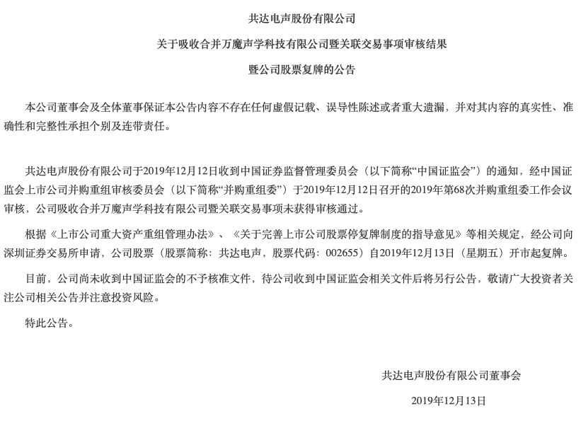 共达电声公告称,在证监会上市公司并购重组委员会12月12日召开的2019年第68次并购重组委工作会议上,其吸收合并万魔声学科技有限公司暨关联交易事项未获得审核通过。