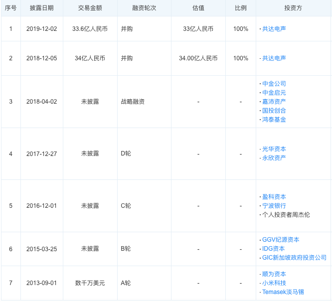 作为小米生态链的供应商,万魔声学在2013年9月的A轮融资中就获得了小米科技及小米旗下顺为资本,以及新加坡淡马锡的投资。