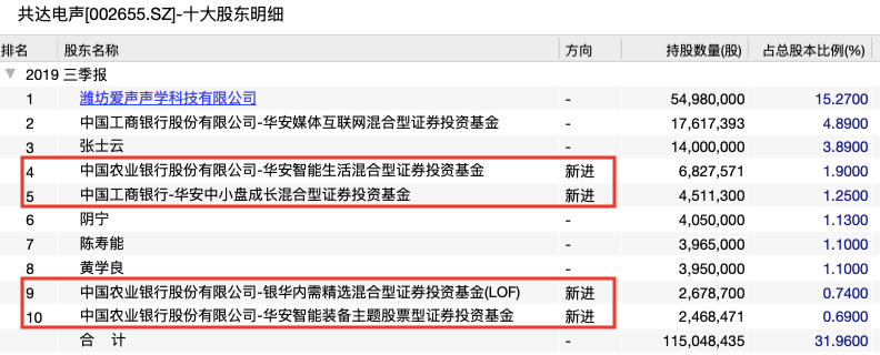 涨势良好引来资金青睐,资金追捧又推动股价走高。2019年三季度,华安基金旗下三只基金及银华内需精选混合型证券投资基金(LOF)均新进共达电声前十大股东。