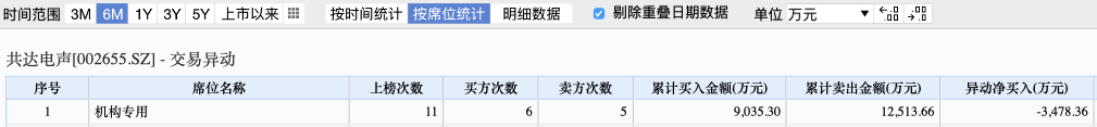 据统计,近半年来,机构专用席位净卖出共达电声3478.36万元。