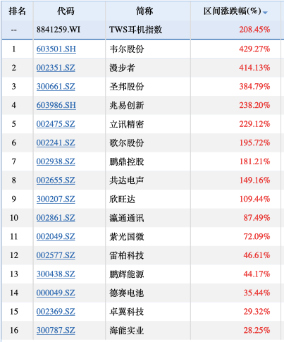 Wind数据显示,TWS耳机指数年内涨幅已达到208.45%,大幅跑赢行业其他指数板块。