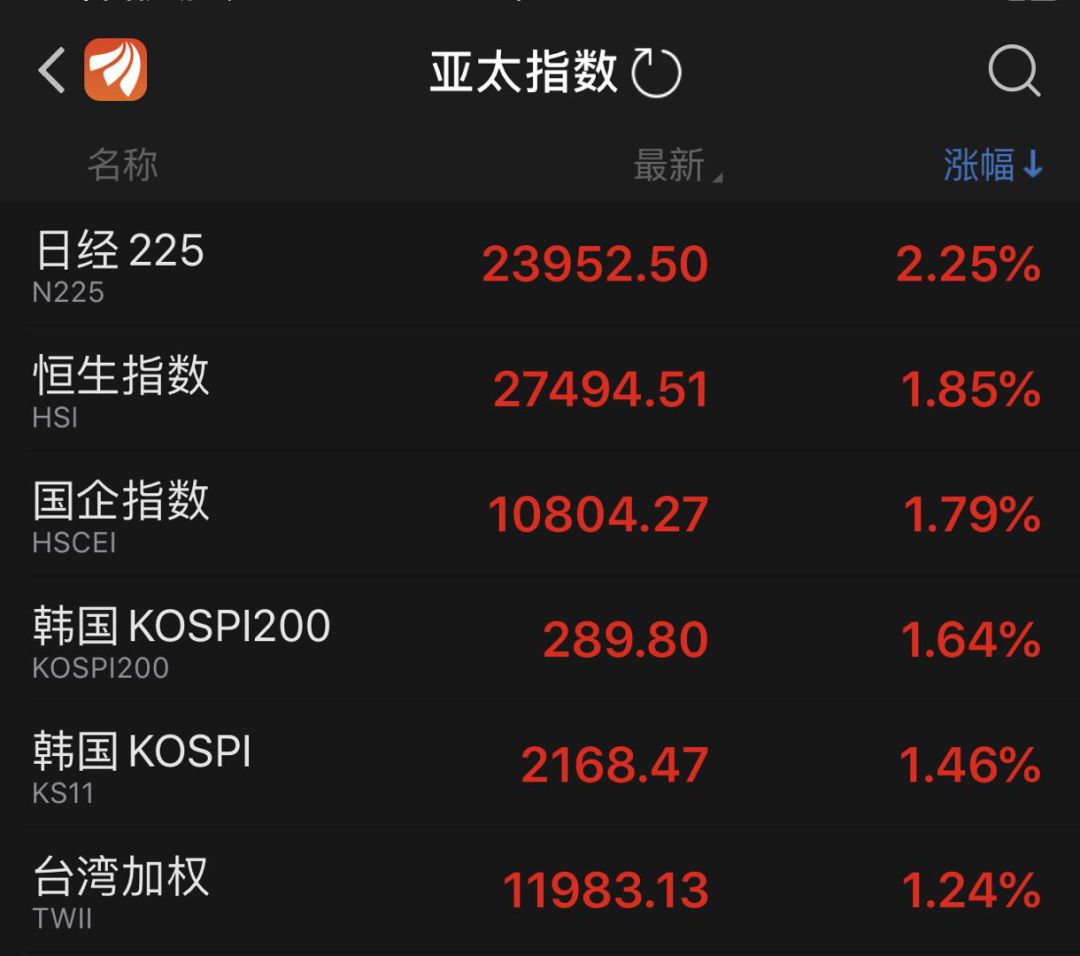 全球风险资产亦受多重乐观情绪推动而走高。亚洲开盘时段,主要股指皆全线走高。