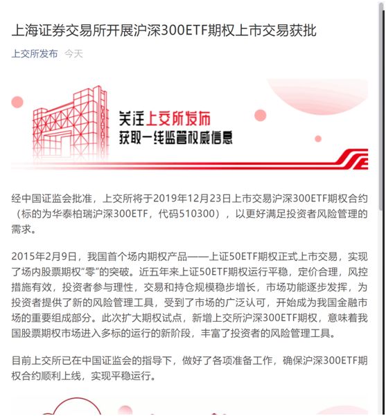 上交所表示,经证监会批准,将于2019年12月23日上市交易沪深300ETF期权合约(标的为华泰柏瑞沪深300ETF,代码510300),以更好满足投资者风险管理的需求。