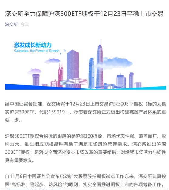 深交所则表示,经证监会批准,将于12月23日上市交易沪深300ETF期权(标的为嘉实沪深300ETF,代码159919),标志着深交所正式迈出构建完备产品体系的重要一步。