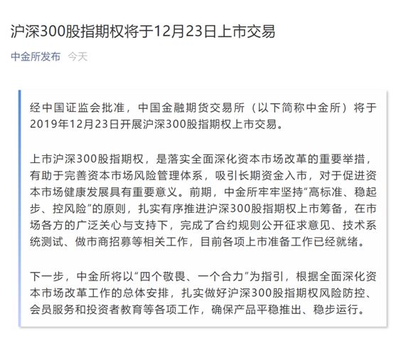 中金所也表示,经证监会批准,将于2019年12月23日开展沪深300股指期权上市交易。