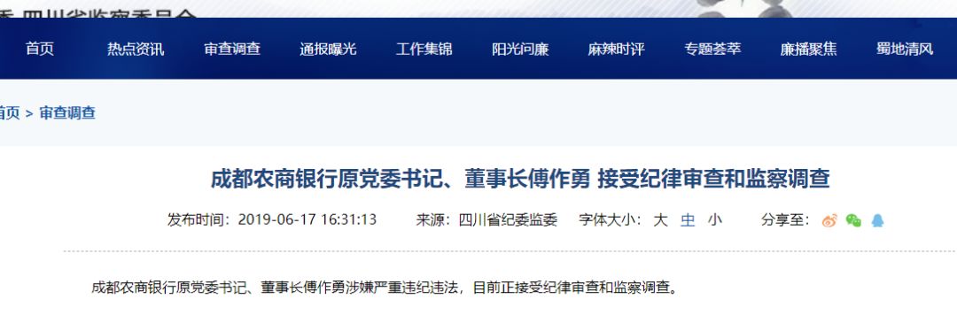 6月17日,四川省纪委监委网站发布消息称,成都农商银行原党委书记、董事长傅作勇涉嫌严重违纪违法,目前正接受纪律审查和监察调查。