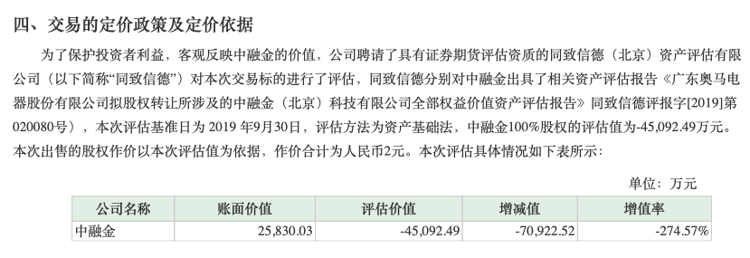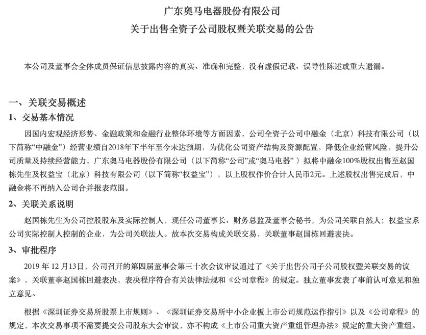 根据公告,奥马电器拟将旗下全资子公司中融金100%股权出售给赵国栋及权益宝,作价2元。上述股权出售完成后,中融金将不再纳入奥马电器合并报表范围。