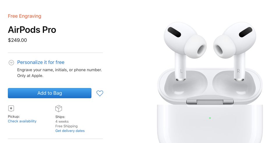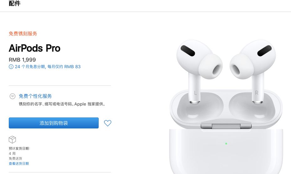情况究竟如何?e公司记者登陆苹果美国官网显示,目前售价249美元的AirPods Pro仍可下单,但发货周期需要4周。