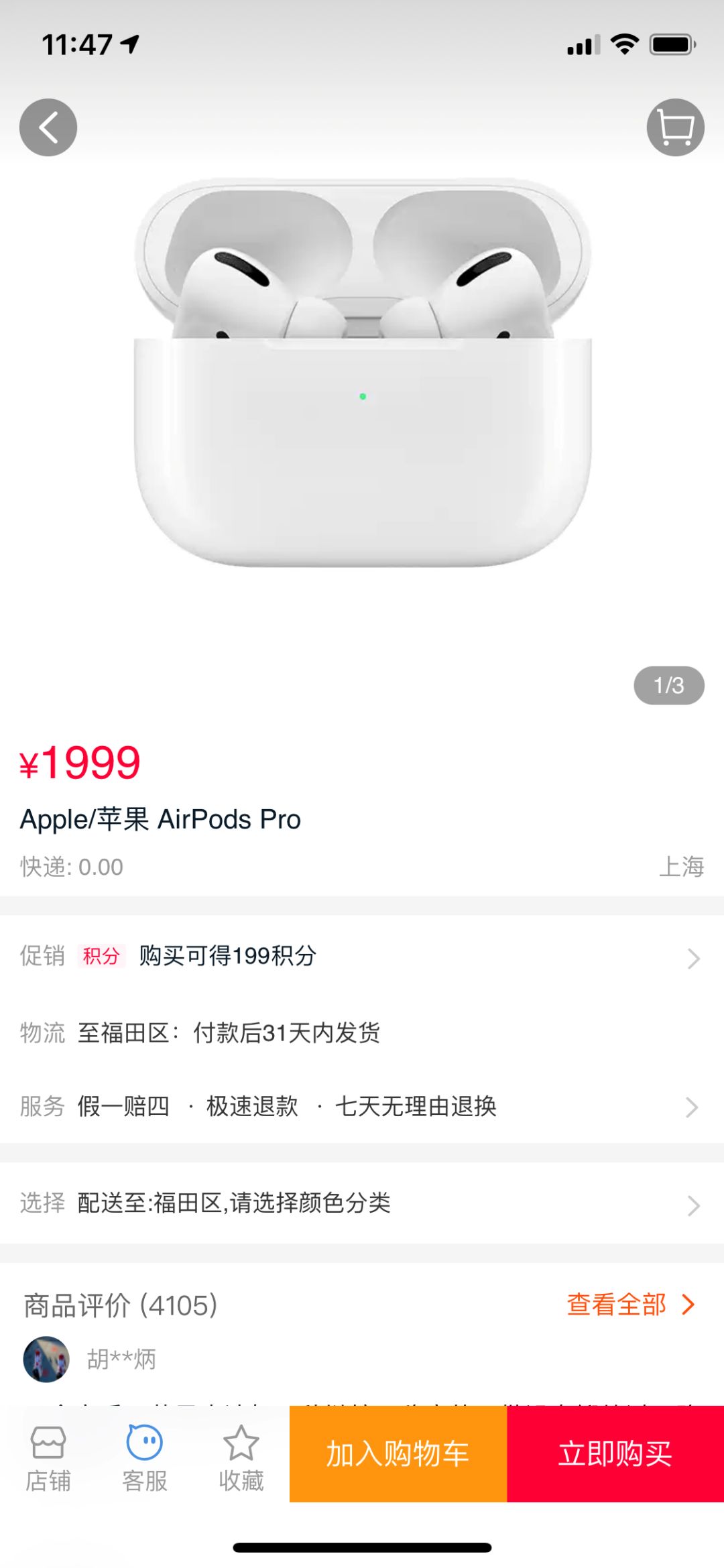 在苹果中国官网,售价1999元的AirPods Pro同样需要四周发货,且每位顾客限购2部。天猫苹果官方店,AirPods Pro没有现货,下单付费后预计等待31天才能收货。
