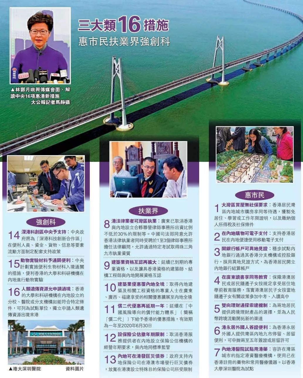林郑月娥欢迎中央政府于领导小组会议后,公布16项普及惠民及便利香港专业界别到大湾区发展的政策措施。有关措施将进一步便利港人在大湾区内地城市发展、就业和居住,以及加强大湾区内人流、物流、资金流等方面便捷流通。
