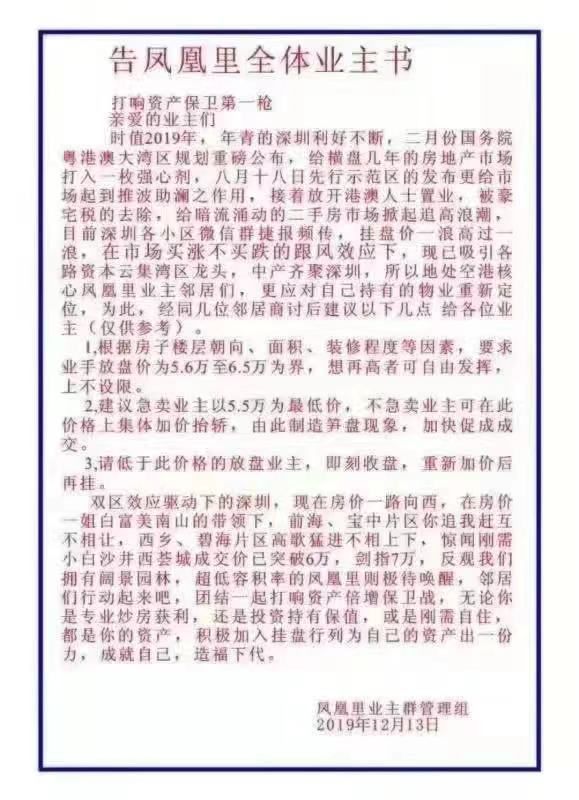 近日,一份深圳某小区业主管理组发布的《告凤凰里全体业主书》在网上流传。