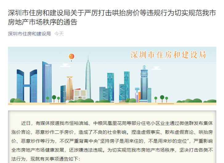 对此,深圳市住房和建设局发布通知,关于严厉打击哄抬房价等违规行为切实规范我市房地产市场秩序的通告。