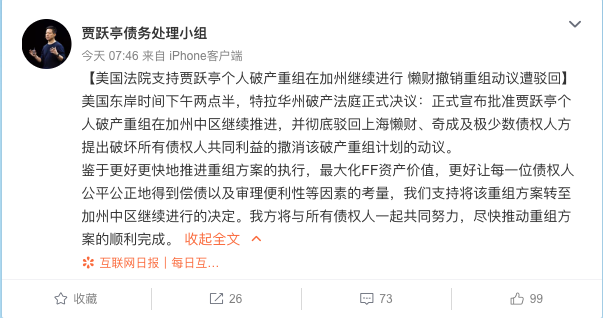 该微博称,美国东岸时间下午两点半,特拉华州破产法庭正式决议:正式宣布批准贾跃亭个人破产重组在加州中区继续推进,并彻底驳回上海懒财、奇成及极少数债权人方提出破坏所有债权人共同利益的撤消该破产重组计划的动议。