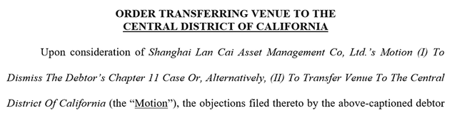 最终,特拉华州的破产法庭听取了联邦破产署的建议,将此案移交至加州中区法院继续进行。上海懒财或奇成等方面提出的诉求,得到了特拉华州破产法院的支持。