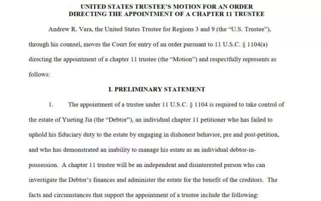 12月17日,外媒曝光的另一份文件——美国司法部下属的美国受托人执行办公室(US Trustee)发布的声明显示,贾跃亭存在诸多不诚信行为,委托人已经不适宜继续对其资产保持控制权,要求任命新的受托人。