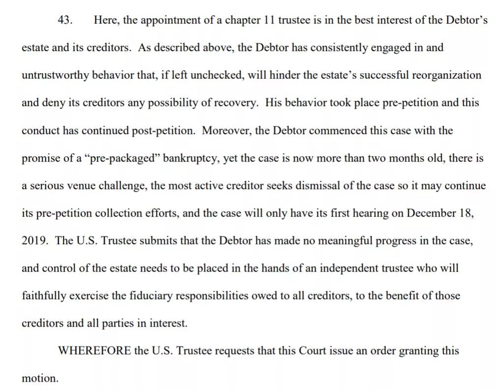 意见书称:“债务人持续地进行不诚信的行为。这些行为在申请个人破产之前就已存在,并且持续到申请之后。如果这些行为不被制衡,将会阻碍破产重组的顺利实施,并且剥夺债权人获得赔偿的应得权利。”