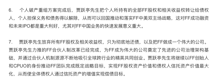 贾跃亭提交的破产重组方案,本应该围绕其个人资产进行清算和债务归还,但很大程度上却将债务捆绑到了FF身上。此前贾跃亭债务处理小组宣称: