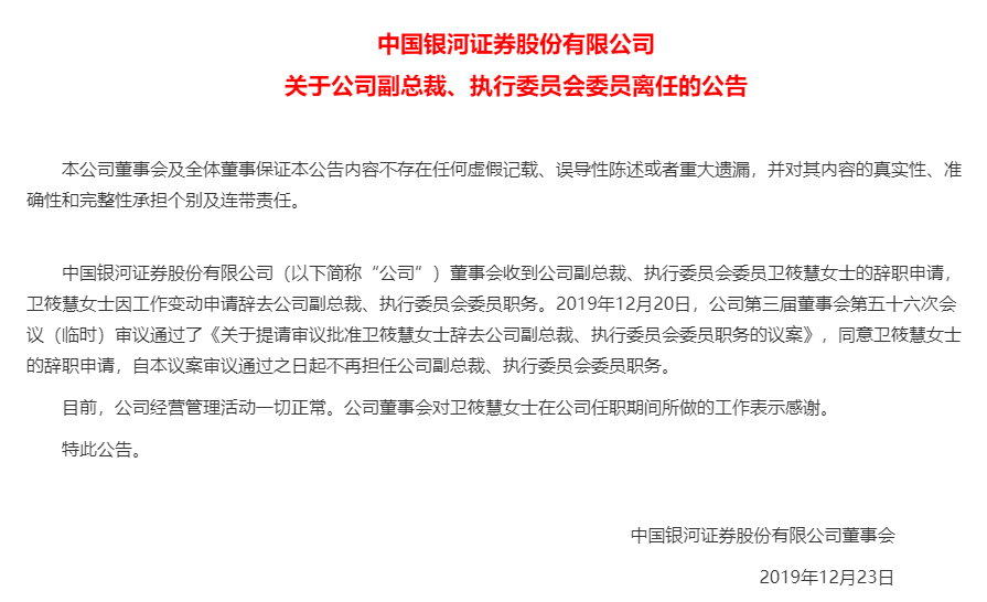 12月22日晚间,银河证券发布公告称,董事会收到公司副总裁、执行委员会委员卫筱慧女士的辞职申请,理由是“工作变动”。在12月20日经董事会审议通过后,卫筱慧的离职申请获得批准。
