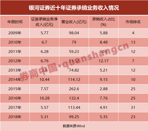 随后,在2017年9月下旬,银河证券投行部拖欠奖金部分下发。2017年11月,同为执委会委员的股权融资业务线业务总监汪六七因“个人原因”请辞。历经两年发展,银河证券投行业务虽有一定气色,但与银河证券目前的体量和市场地位并不匹配。