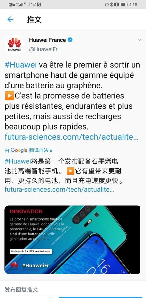 随后,华为法国官方推特转发了该报道,并称华为将第一个发布搭载石墨烯电池的高端智能手机!