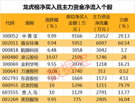 从盘口资金流向来看,主力资金净流入超千万且龙虎榜净买入个股共有9只,其中中青宝、盾安环境、凌云股份等个股资金净流入金额最大。净流入力度最大的个股有欣龙控股、一汽夏利、盾安环境,净流入力度分别为79.79%、64.85%、60.54%。