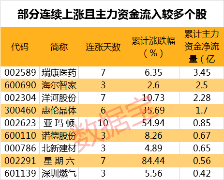 值得注意的是,129只连续上涨个股中,4只个股期间主力资金累计净流入超过亿元。其中,累计资金流入最多的为瑞康医药,主力资金累计流入3.45亿元。