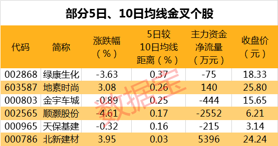 截至最新收盘,有6只A股的5日均线主动上穿10日均线,其中绿康生化、地素时尚、金宇车城等个股的5日均线较10日均线距离最大,分别达0.37%、0.26%、0.25%。