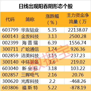 截至最新,两市共有10只个股日K线出现阳吞阴形态,当天涨幅最大的是海普瑞、华友钴业、福斯特,涨幅分别为6.39%、5.35%、5.22%。