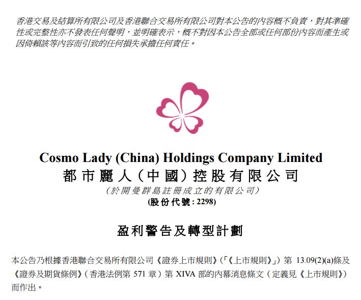 2019年12月23日,都市丽人(中国)控股有限公司发布盈利警告及转型计划