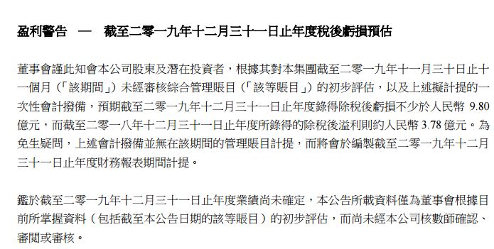 2019年它过得有“多惨”呢?不久前刚发布的公告显示,其预计2019年公司亏损数目将不少于9.8亿元。而根据财报,2018年的除税后溢利约为3.78亿元。