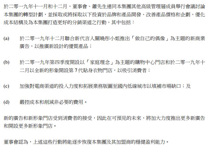 另外,董事会也注意到,过往的快速扩张导致自营门店和加盟商门店库存增加。店铺的店效和盈利能力受到不利影响,并导致本集团及其加盟商的财务状况转弱。