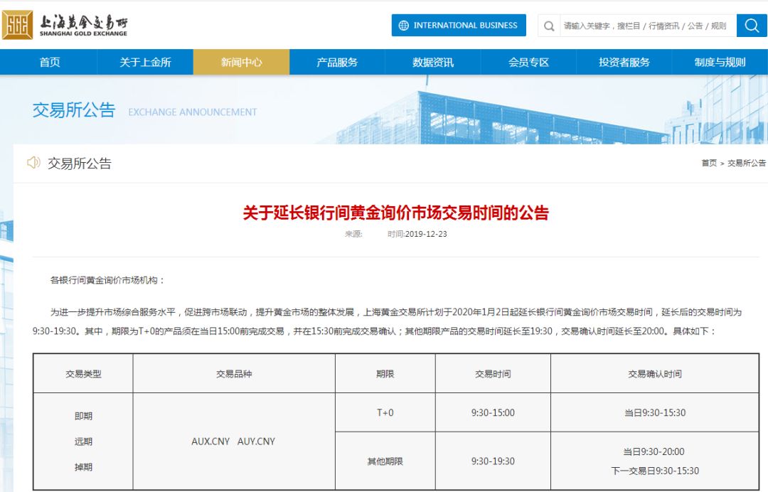 12月23日,上金所公告,为提升黄金市场整体发展,将于2020年1月2日延长银行间黄金询价市场交易时间,延长后的交易时间为9:30-19:30。