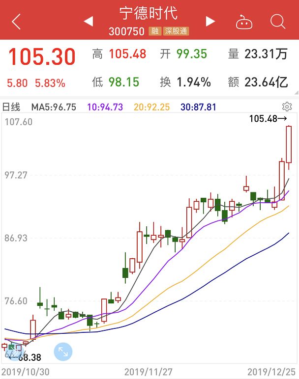 尽管在整车领域,比亚迪等本土公司倍感压力,但特斯拉在中国市场持续获利,也为中国最大的动力电池公司提供了上涨动力。尽管传出特斯拉上海工厂,或将与宁德时代的最大对手韩国LG化学合作,但12月25日,宁德时代盘中大涨接近6%,两日累计涨幅逾13%,突破100元关口,股价报105.3元,市值两日飙涨超270亿,创公司上市以来历史最高纪录,总市值突破2300亿元,超过迈瑞医疗成为创业板市值第一。