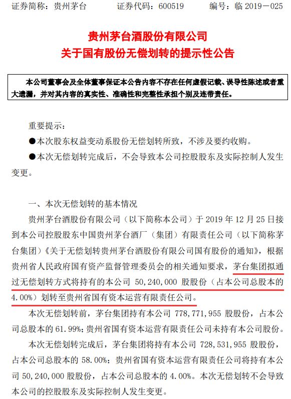 12月25日晚间,贵州茅台发布国有股份无偿划转公告。贵州茅台于25日接到控股股东茅台集团通知,根据贵州省国资委的相关通知要求,茅台集团拟通过无偿划转方式将持有的贵州茅台5024万股股份(占总股本的4.00%)划转至贵州国资公司。