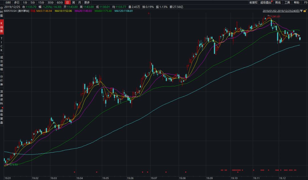 作为白酒行业当之无愧的行业老大,贵州茅台在2019年也曾经历艰难坎坷,多次迎接负面消息。但其股价却从不足600元一路走高,在上月攀至1241.61元/股的高价。以最新数据计算,贵州茅台年内市值飙升超过7000亿元。