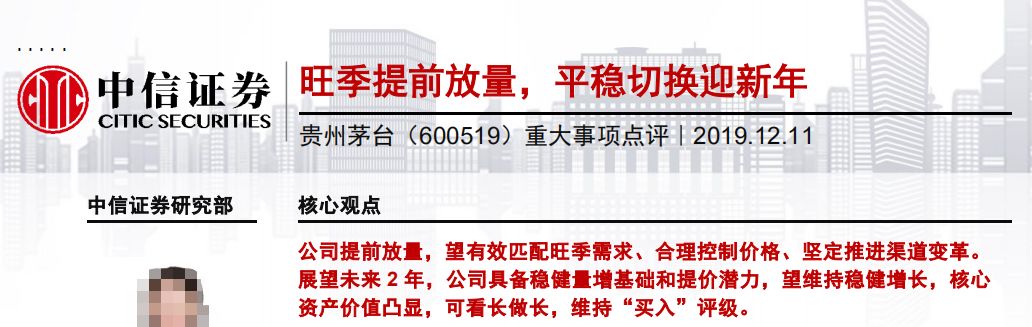 即便如此,各家券商研报仍坚定看好贵州茅台。例如,中信证券即在研报中指出,茅台业绩增长确定性强,未来1-2年具备提价可能。综合量价,公司2020年收入同增10%-15%、净利润同增15%以上的确定性强。同时,茅台坚定不移、有条不紊推进渠道改革,积极管控渠道和批价,正在为渠道丰厚利润回归上市公司打牢坚实基础。本轮景气周期仍将持续较长时间,看好高端酒核心资产价值。