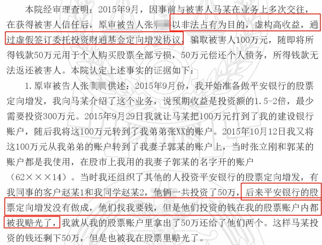 但张某后来知道,平安银行的定增投资很难做,自己也根本没有销售该定增产品的资格。受害人马某及另外两名客户将150万资金转入后,张某就开始通过妻子的证券账户进行炒股。无奈的是,张某炒股巨亏,在同学和同事客户的追债下,张某不得不将其中50万元还回去,而属于马某的100万元则全部亏完。